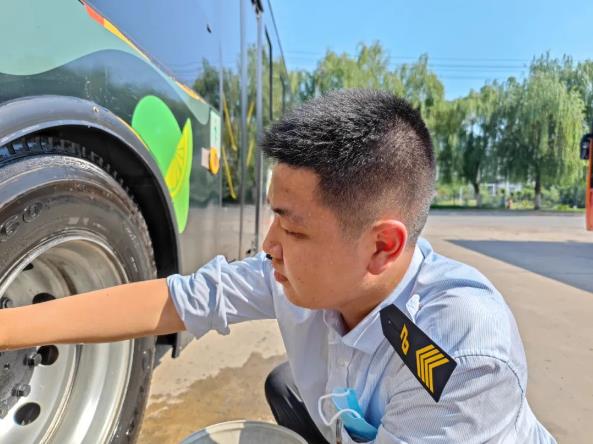 “衣服都濕透了,別弄了,先歇歇吧?!薄皼]事,我把衛(wèi)生弄好了就去?!?.....眼前這個(gè)小伙是603路的張?zhí)祧?,趁著休停時(shí)間,他一邊用布擦拭著輪轂,一邊用手擦拭臉上的汗珠。忙完后,發(fā)現(xiàn)發(fā)車時(shí)間已到,他立即回到駕駛室,等待乘客的到來和發(fā)班指令,沒來得及喝上一口水。