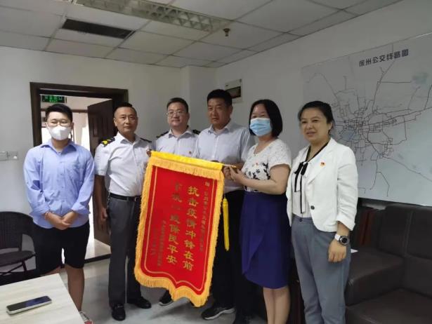 7月28日上午,泉山區(qū)段莊街道紡西社區(qū)書記余蘭,副主任王艷宇把一面印有“抗擊疫情沖鋒在前,下沉一線保民平安”的錦旗送到公交集團。