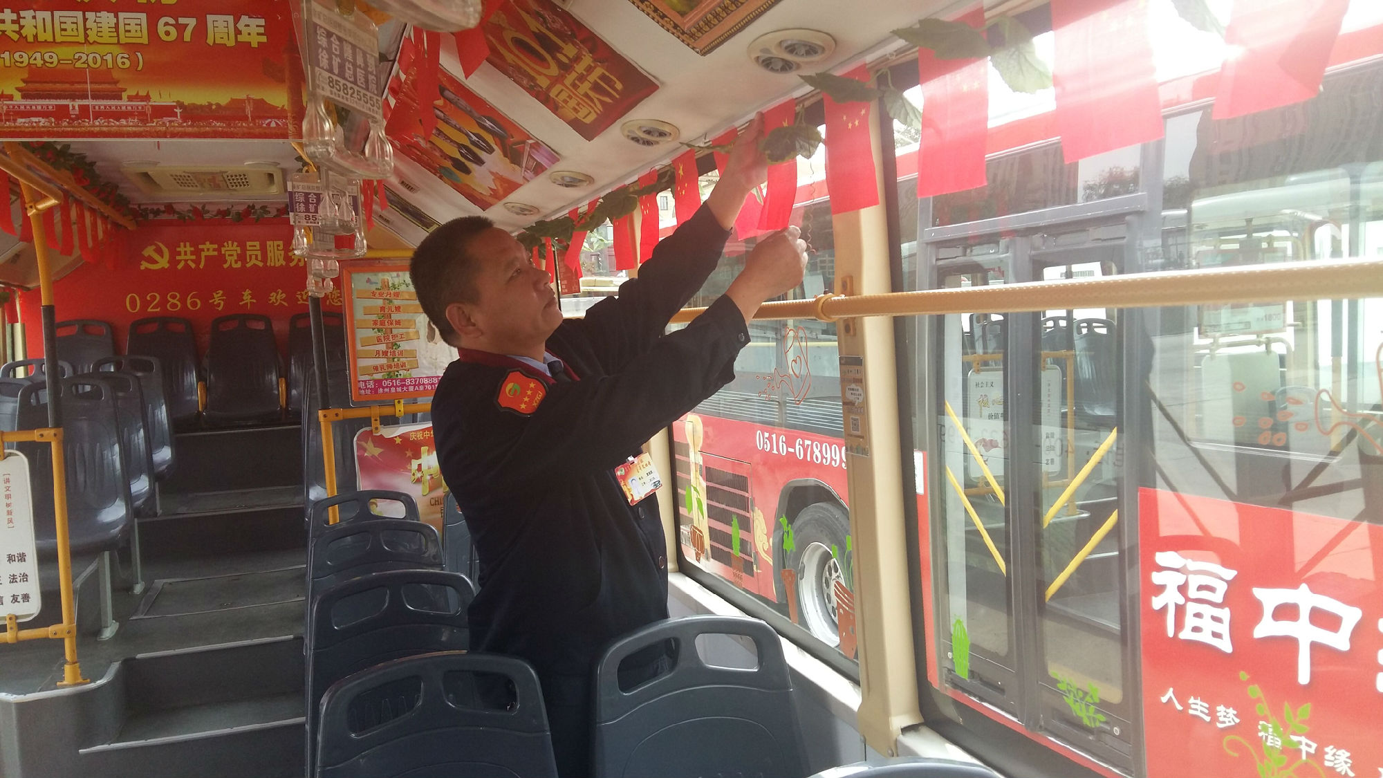 公交駕駛工作平凡、枯燥,但曹瑞國(guó)愛動(dòng)腦、喜創(chuàng)新,總會(huì)給乘客不一樣的驚喜,感受不一樣的出行服務(wù)。適逢節(jié)日、活動(dòng),他總會(huì)換著花樣地自掏腰包,給車上乘客一個(gè)驚喜:春節(jié),購(gòu)置小紅燈籠掛滿整個(gè)車廂,給乘客帶來濃濃的年味;母親節(jié),他準(zhǔn)備了100支康乃馨、祝???,送給“媽媽級(jí)”女乘客,道上一聲由衷的問候;今年七一,為慶祝建黨95周年,他準(zhǔn)備了95面黨旗,95本黨章,以及黨徽、紀(jì)念章給乘客,并在車廂廣播入黨宣言、革命紅歌;9月22日宣傳世界無(wú)車日,他制作了10個(gè)卡通宣傳牌,加班安裝在車廂四周,號(hào)召市民選用綠色交通工具出行,減少城市污染;十一,他將一百面國(guó)旗掛在車廂內(nèi),被媒體稱為“國(guó)旗哥”;10月9日重陽(yáng)節(jié),為老年乘客發(fā)放免費(fèi)鞋墊……