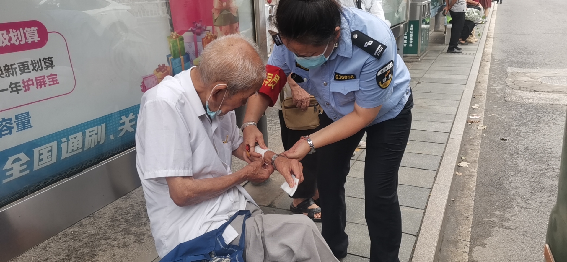 8月2日上午8時(shí)許,公交督導(dǎo)員孫琪在朝陽站開展站臺執(zhí)勤工作時(shí),突然聽到有人大喊:“快來救一下,有人摔倒了!”孫琪當(dāng)即上前查看情況,發(fā)現(xiàn)一位老人癱坐在站臺上,不停地喘著粗氣,胳膊上有一個(gè)大傷口,鮮血直流。