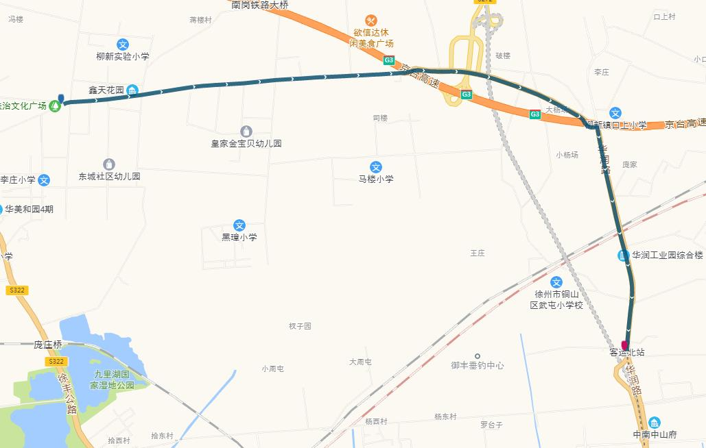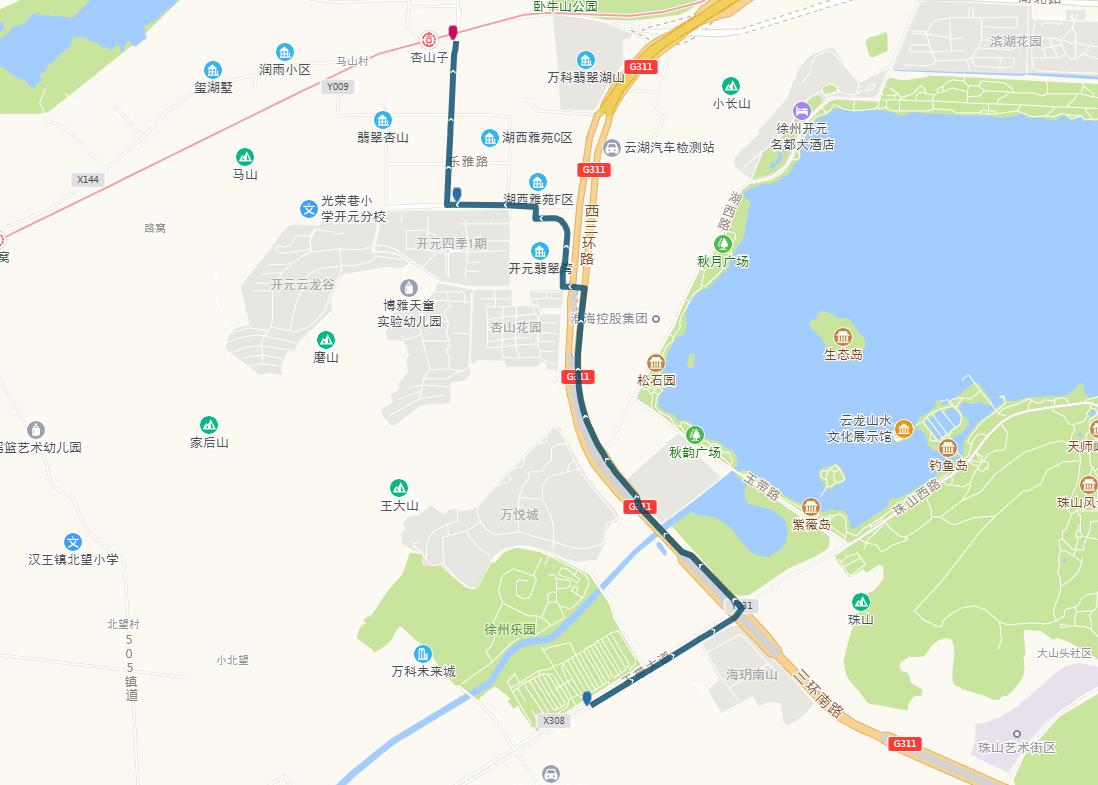 線路站點:山南小鎮(zhèn),山水龍瑞,馬場湖路口,馬場湖,怡康花園,后勤學(xué)院北,誠坤鋼材市場,蘇堤北路立交橋(西),蘇堤北路立交橋(東),蘇堤路小學(xué),永業(yè)花園小區(qū),江蘇四監(jiān),銅沛路東口,中山北路立交橋