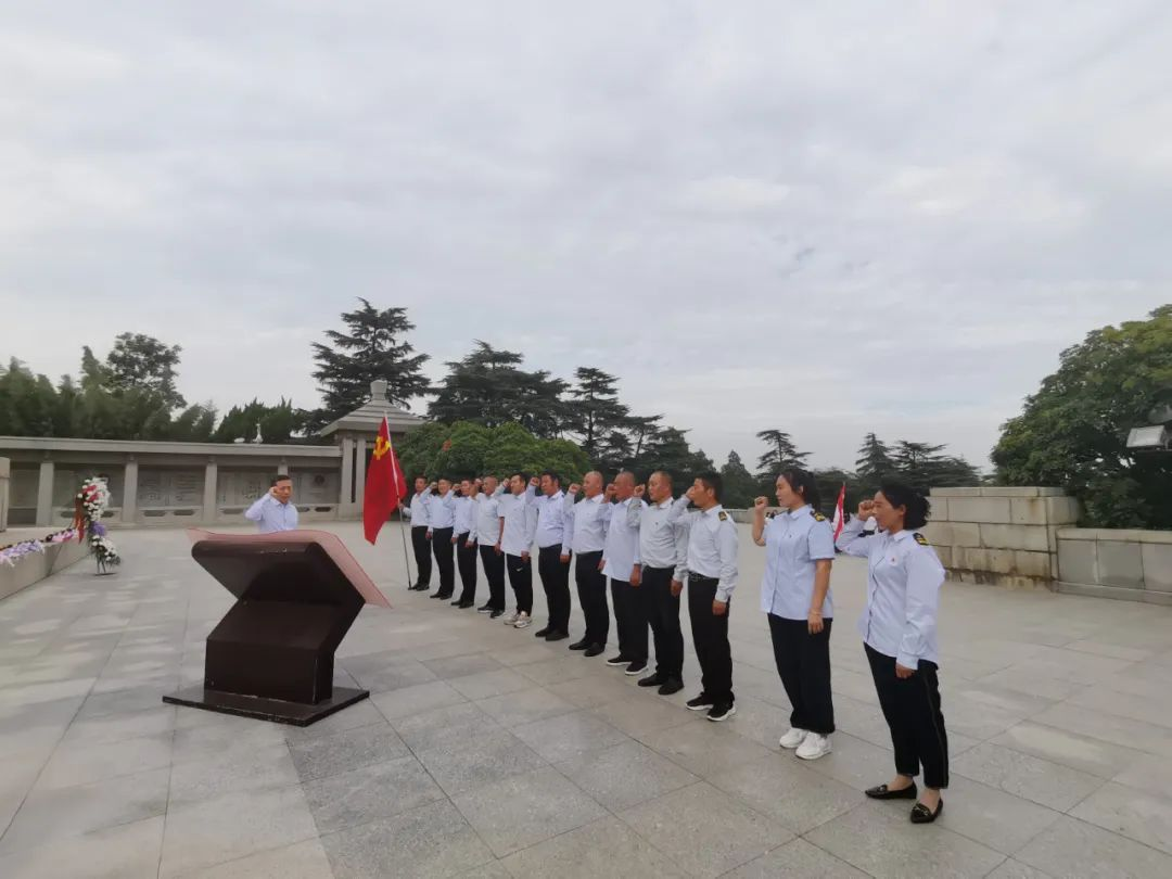 淮海戰(zhàn)役烈士紀(jì)念塔坐落在徐州市市南郊鳳凰山東麓,面向朝陽,巍然聳立。黨員們懷著無比崇敬的心情,在烈士紀(jì)念塔前整齊列隊,神情肅穆,向烈士默哀致敬!