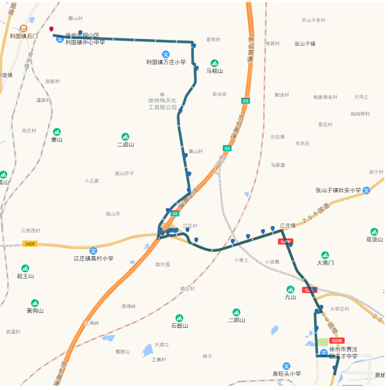 ??空军c:賈汪客運站,宏安路口,賈汪老站,大李莊,江莊南,江莊北,鐃鈸,龍山水泥廠,萬莊,馬元,郝家,蔡山,利國。