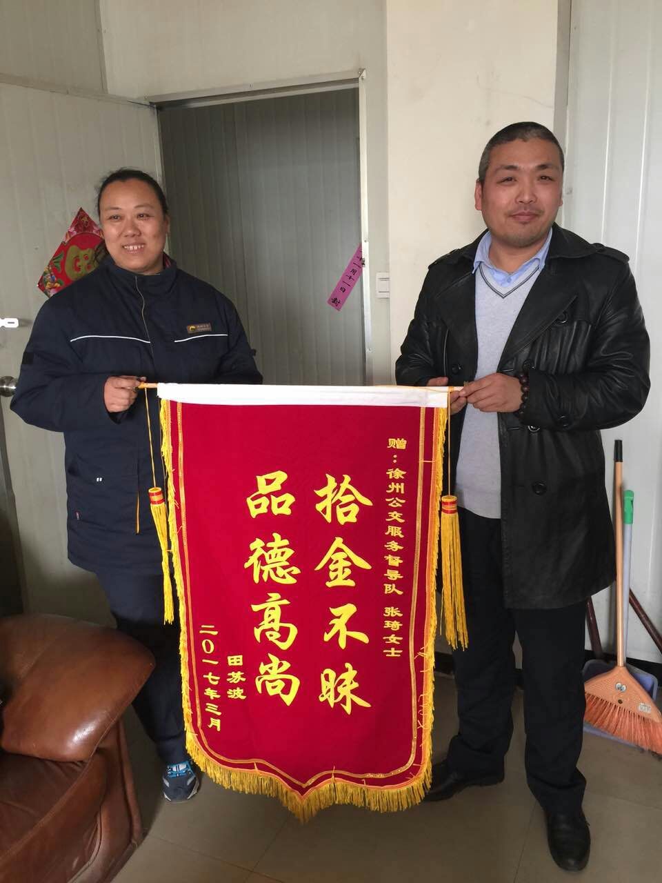 3月29日,正在站臺(tái)執(zhí)勤的督導(dǎo)員張琦撿到乘客掉落的公文包,經(jīng)查看發(fā)現(xiàn)包內(nèi)有蘋果筆記本一臺(tái)和一個(gè)錢包,但并沒有找到皮包主人的聯(lián)系方式。張琦把包放在了調(diào)度室等待失主來認(rèn)領(lǐng),約一小時(shí)后失主匆忙趕來尋找。失主見到失而復(fù)得的皮包非常激動(dòng),經(jīng)過詢問得知失主姓田在徐州礦業(yè)大學(xué)工作。田先生說,“電腦里存有非常重要的資料和聯(lián)系方式,丟包之后萬分焦急,真心感謝公交督導(dǎo)員。”隨即從錢包里拿出400元錢塞給張琦作為答謝,張琦表示:“路不拾遺本就是自己的義務(wù),作為站臺(tái)督導(dǎo)員經(jīng)常會(huì)在站臺(tái)撿到乘客掉落的物品,不管東西貴重與否我們都會(huì)幫失主妥善保管等待認(rèn)領(lǐng)。”3月31日,田先生和他的愛人送來錦旗表示感謝!