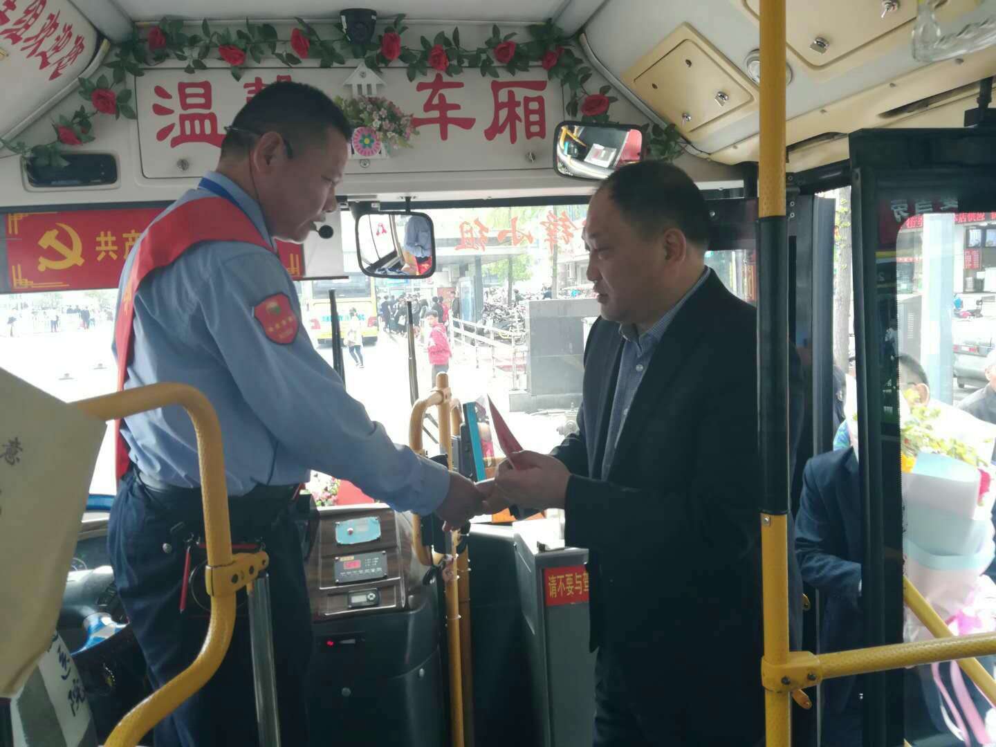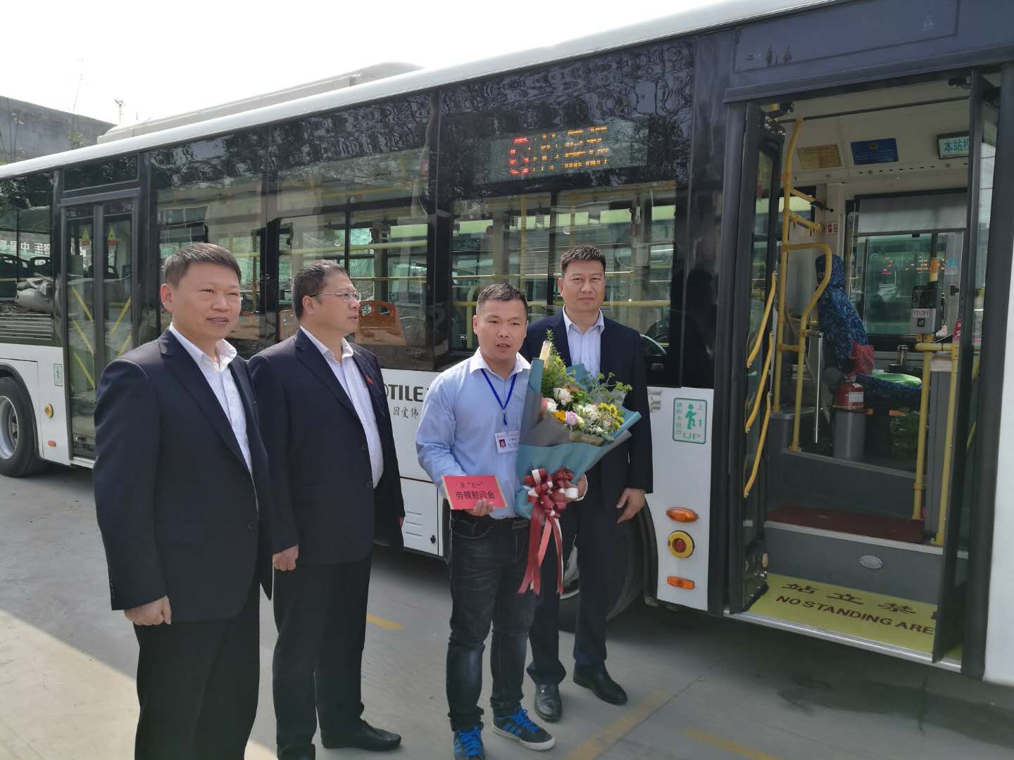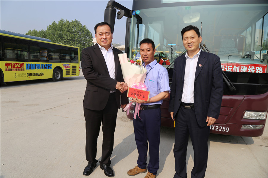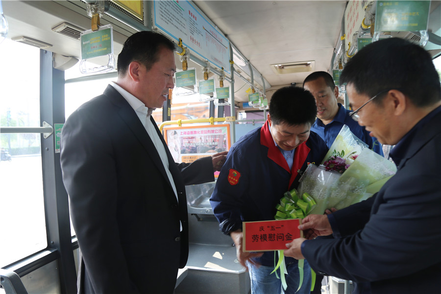 杜紅軍一行首先來到韓山終點(diǎn)站,剛行駛完一趟的市勞模、49路線駕駛員王博正利用休停時(shí)間打掃車輛,杜總走上前親切地與王博握手,并把一束嬌艷芬芳的鮮花和勞模慰問金送到他手中。